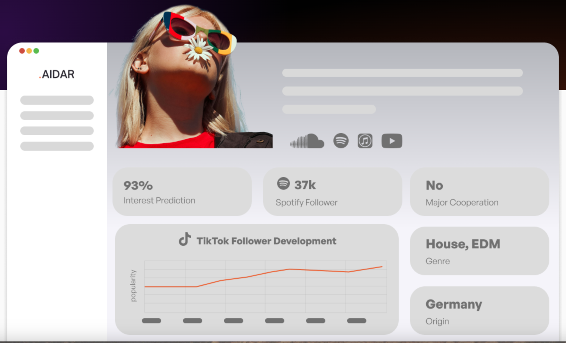 AIDAR ist ein KI-gestütztes A&R-Tool, das personalisierte Empfehlungen für Künstler:innen erstellt. Diese Empfehlungen basieren auf Kriterien wie Genre, Stil und der künstlerischen Ausrichtung eines Labels oder A&R-Teams. AIDAR unterstützt insbesondere den Scouting-Prozess, indem es dabei hilft, vielversprechende Talente zu identifizieren, die mit den Anforderungen und Zielen des Labels übereinstimmen. Ziel ist es, die Vorauswahl und Bewertung potenzieller Künstler:innen effizienter zu gestalten.