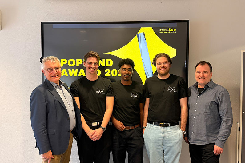 Students Tim Fischböck, Simon Kidane, and Johann Fürstenberg presented their concept for the further development of the Popländ Award at the Baden-Württemberg Ministry of Science, Research, and the Arts. The presentation was part of the Popakademie Baden-Württemberg's project workshop, in which students work on real-life tasks from the music and creative industries. This practice-oriented format is a central component of the Bachelor's degree program in Music Business and the Master's degree program in Music and Creative Industries, enabling theoretical knowledge to be directly transferred into concrete projects—as in this case, the conceptual further development of a state-wide music award.